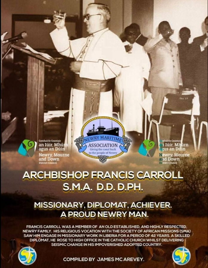 The son of a docker from Castle St, Newry, Archbishop Francis Carroll SMA had a long and highly distinguished career, spanning 42 years, in Liberia. He rose to the highest levels of the Church and received every available civic honour from the Government of Liberia for his outstanding services to the state.